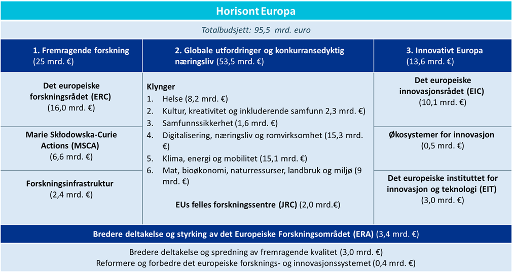 Horisont Europa er verdens største program for forskning og innovasjon med et totalbudsjett på cirka 95 milliarder euro. Horisont Europa består av tre «søyler».